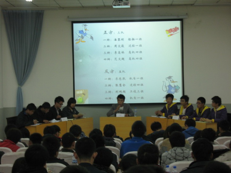 11月27日晚19:00,由太阳成tyc7111cc学生会主办,工业设计113班承办的太阳成tyc7111cc2011级年级辩论赛决赛在高密校区通德会堂202举行。